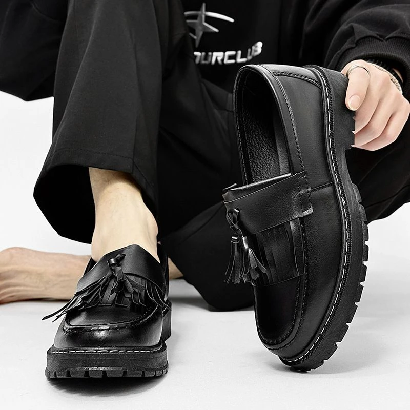 Features: British style women's fashion loafers, patent leather tassel loafers, black thick-soled loafers, slip-on thick-soled loafers, simple casual flat shoes. Soft patent leather fabric, comfortable non-slip low-heel shoes, elegant every step!